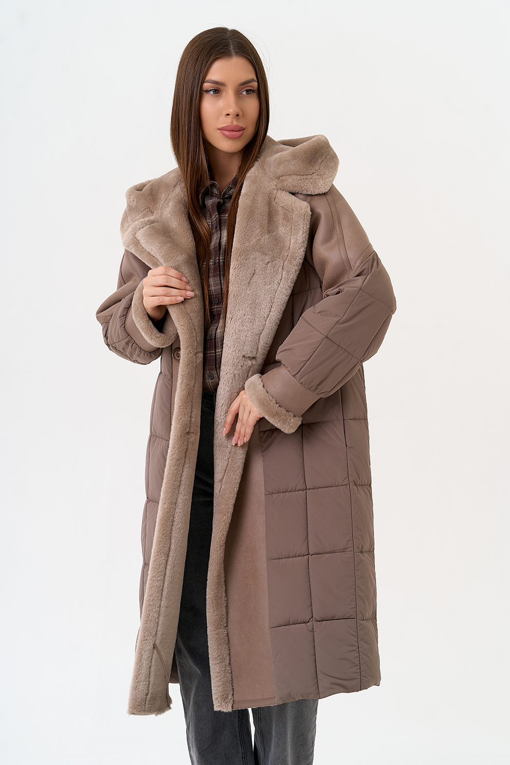Крой воротника - капюшон, отделка эко мех