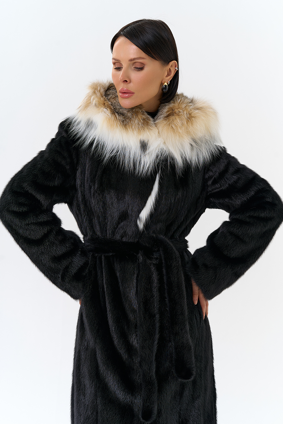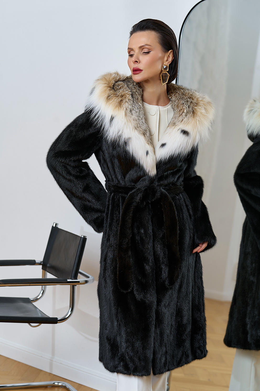 Норковая шуба с капюшоном с отделкой из рыси